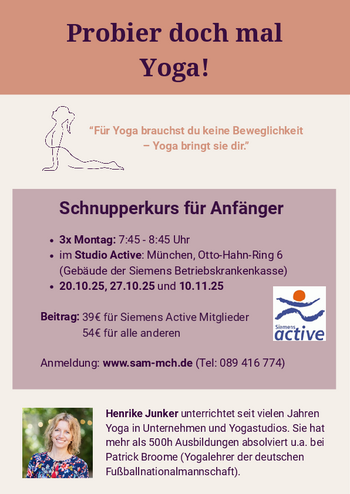 Bleib flexibel mit der Buchung unserer Kursangebote. Als Mitglied von Siemens Active München e.V. erhältst Du einen Rabatt auf jede Kursbuchung. Fast alle Angebote sind zertifiziert von der zentralen Prüfstelle der gesetzlichen Krankenkassen und werden bei regelmäßiger Teilnahme finanziell unterstützt.